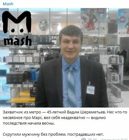 В 06:50 утра в тоннеле появился неизвестный мужчина с молотком в руках. Работница метро попыталась выяснить, что происходит, однако незнакомец, угрожая молотком, запер женщину в дежурной будке. Мужчина приказал Елене Пермяковой вызвать на место руководство Метрополитена и что-то бормотал про пришельцев, передает «Российский Диалог» со ссылкой на канал «112». Канал Mash отмечает, что мужчина сперва появился на открытом участке пути «Автозаводская» — «Технопарк». Машинист начал сигналить, после чего незнакомец скрылся на территории города. Чуть позже он снова оказался на станции. К столичной станции метро «Технопарк» подтянули СОБР, на месте руководство УВД. Спустя некоторое время хулигана задержали. Сейчас мужчину везут в отдел. Известно, что злоумышленник работал охранником в магазине, ему 45 лет. Контролер освобождена и находится в безопасности. В пресс-службе метрополитена сообщили, что Замоскворецкая линия работала без перебоев во время инцидента, а безопасности пассажиров и движению поездов ничего не угрожает. Ранее сообщалось, что в Кривом Роге разъяренные активисты захватили чиновников в заложники. А в Италии разыскиваемый мафиози захватил заложников и потребовал встречи с высокопоставленными чиновниками.